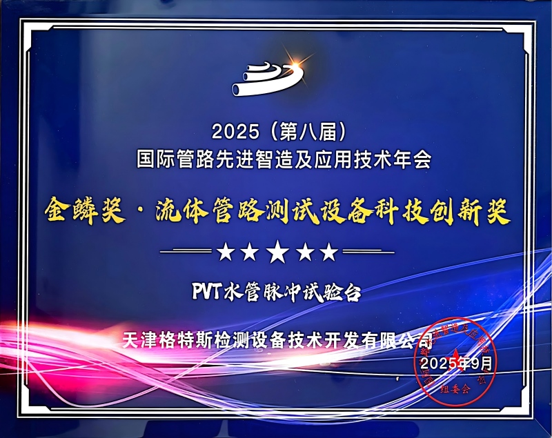 9月24日-26日,2025(第八届)国际管路先进智造及应用技术年会暨国际管路产业展览在苏州盛大启幕,同期,备受瞩目的 “金鳞奖 —2025年度流体管路系统科技创新评选结果” 重磅揭晓!凭借在检测设备领域的突破性技术创新与卓越成果,格特斯从众多实力竞争者中脱颖而出,由公司自主研发的PVT水管脉冲试验台成功斩获金鳞奖·流体管路测试设备科技创新奖。
